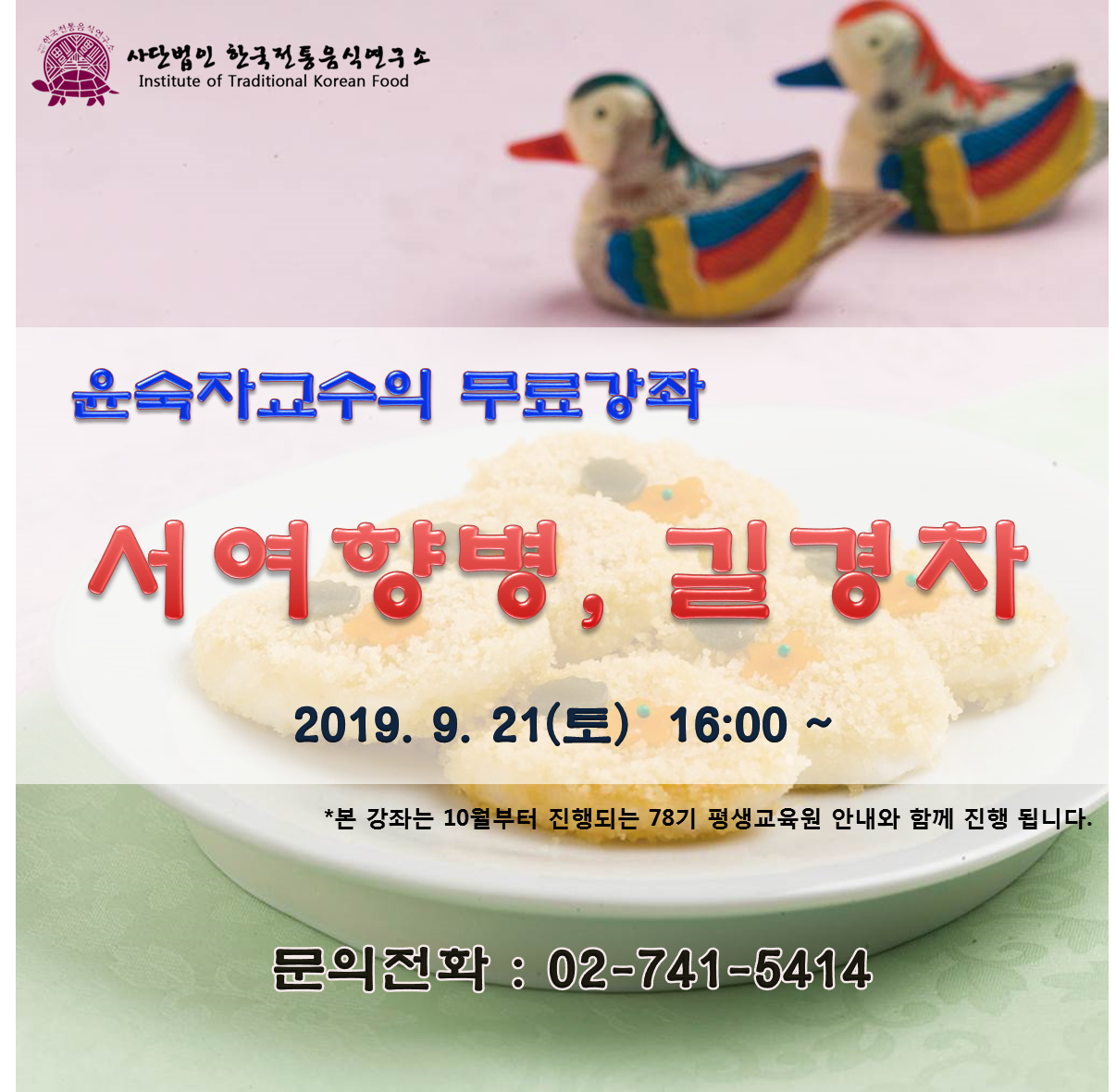 9월 21일 한국전통음식연구소에서 윤숙자 교수님의 무료 공개강좌가 진행됩니다.